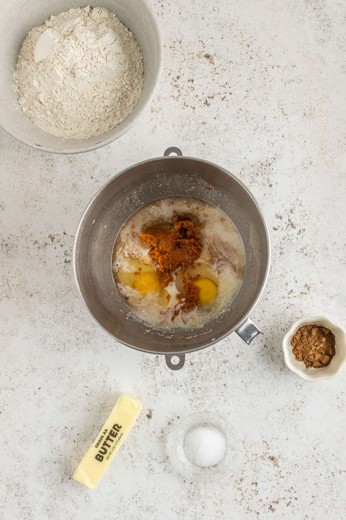 Agrega el azúcar restante, el puré de calabaza, los huevos y la vainilla al tazón y cambia el accesorio de la batidora por un gancho para masa.